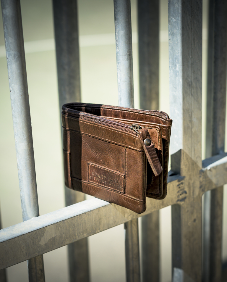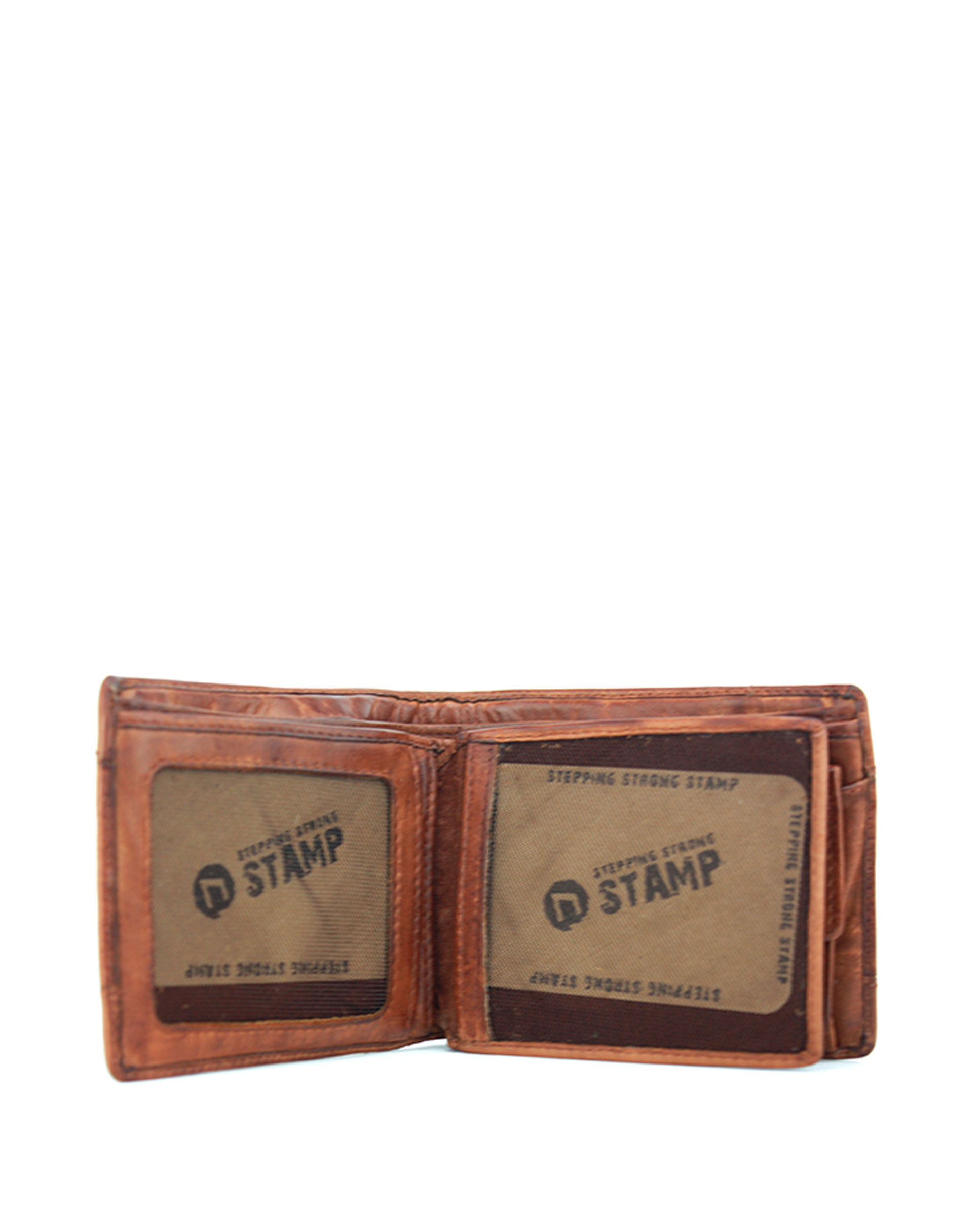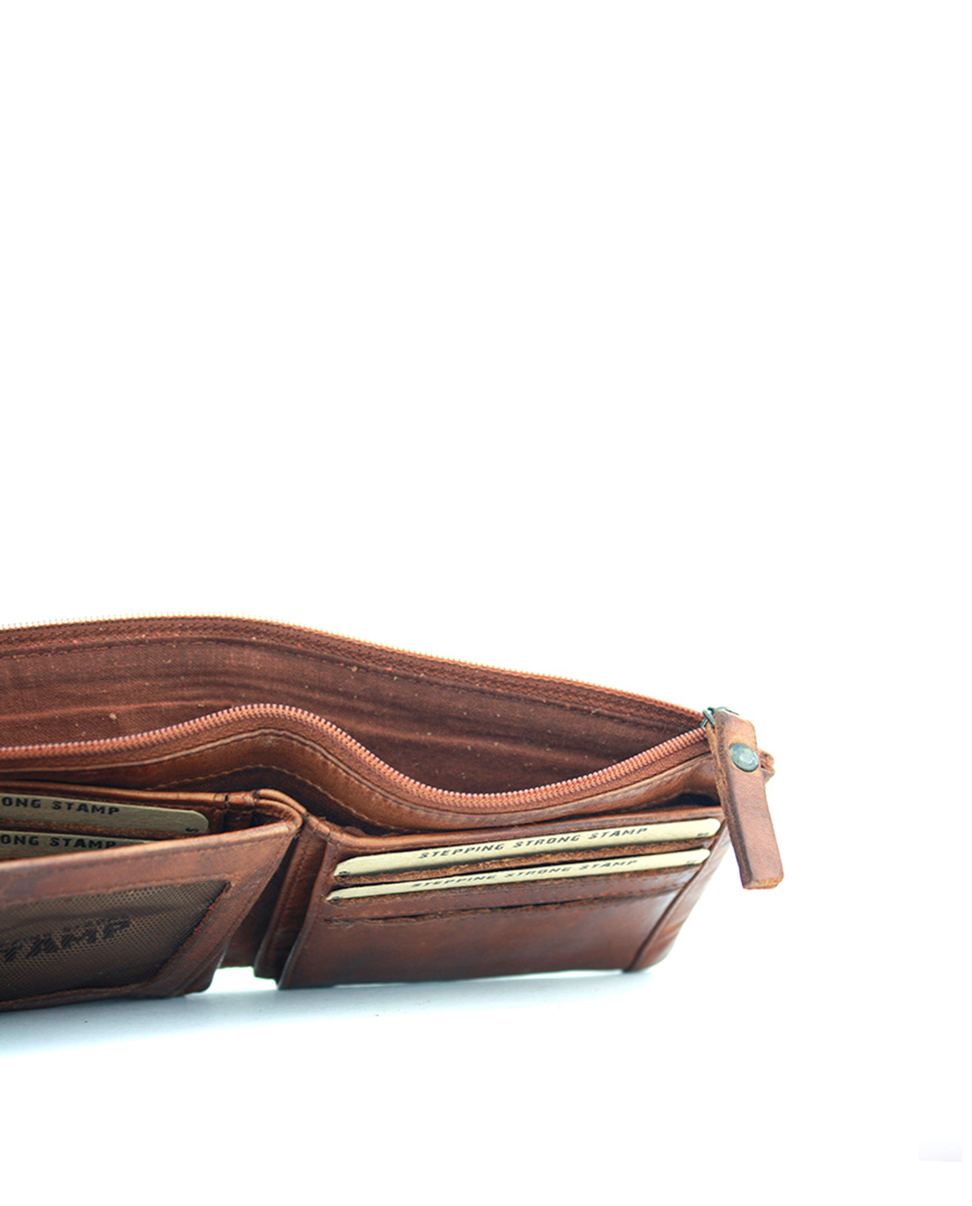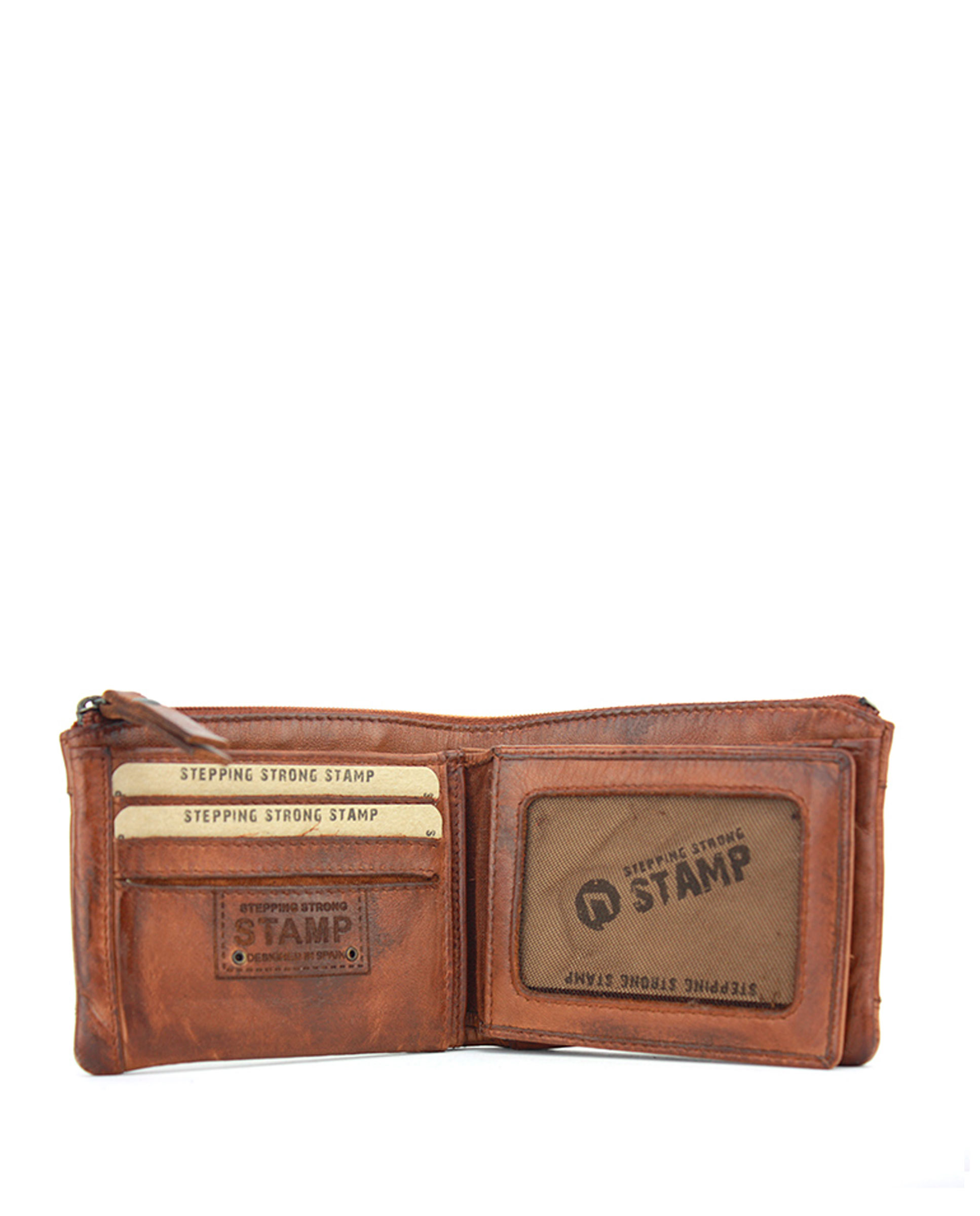 Billetero americano fabricado en piel lavada con capacidad para 10 tarjetas y apartado para billetes. En la parte exterior tiene un bolsillo longitudinal con cremallera que sirve como Portamonedas o como billetero. Colecci贸n Arco.