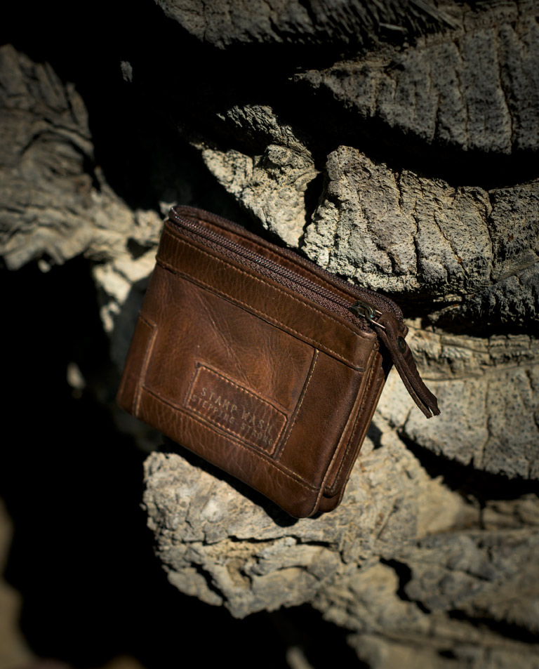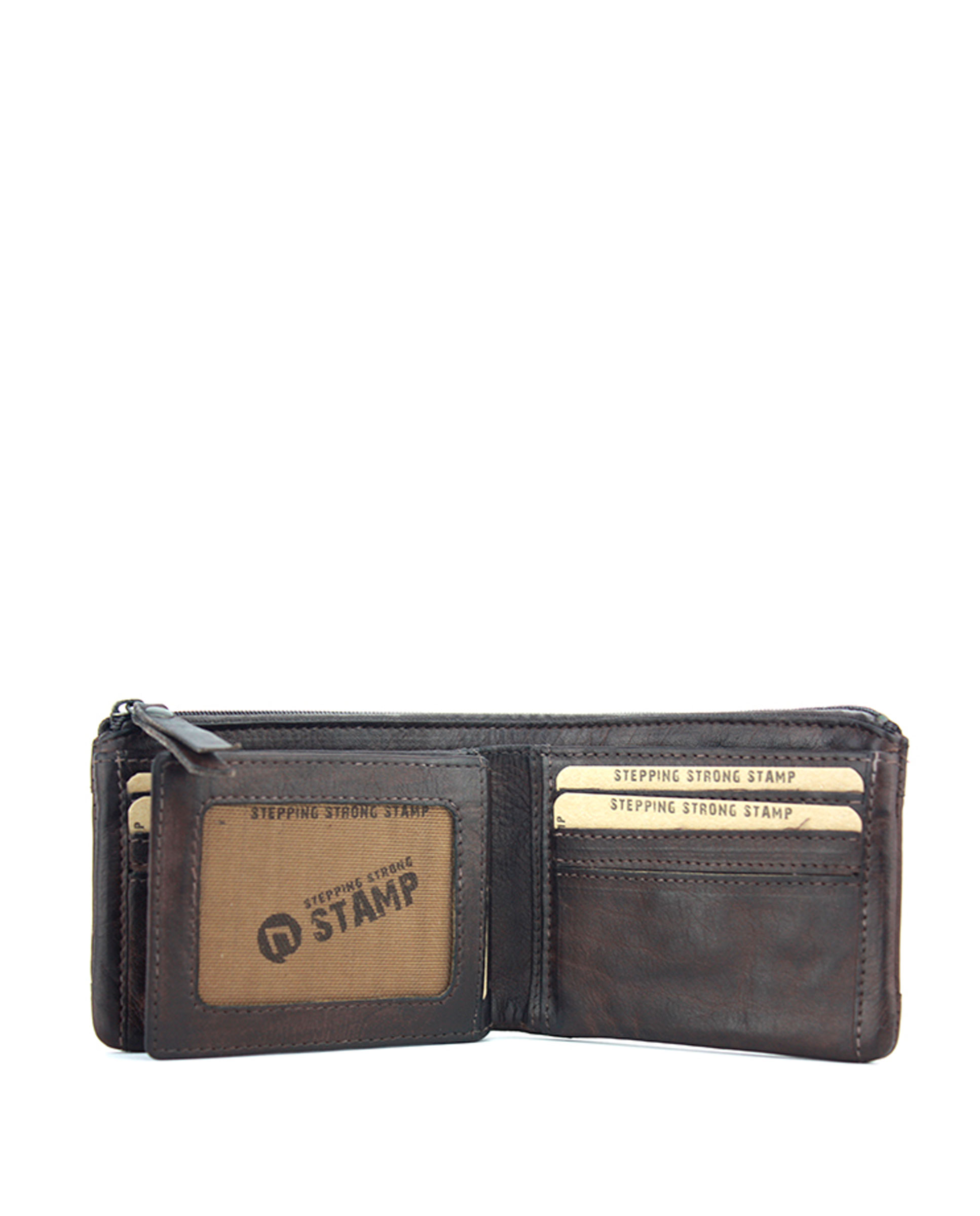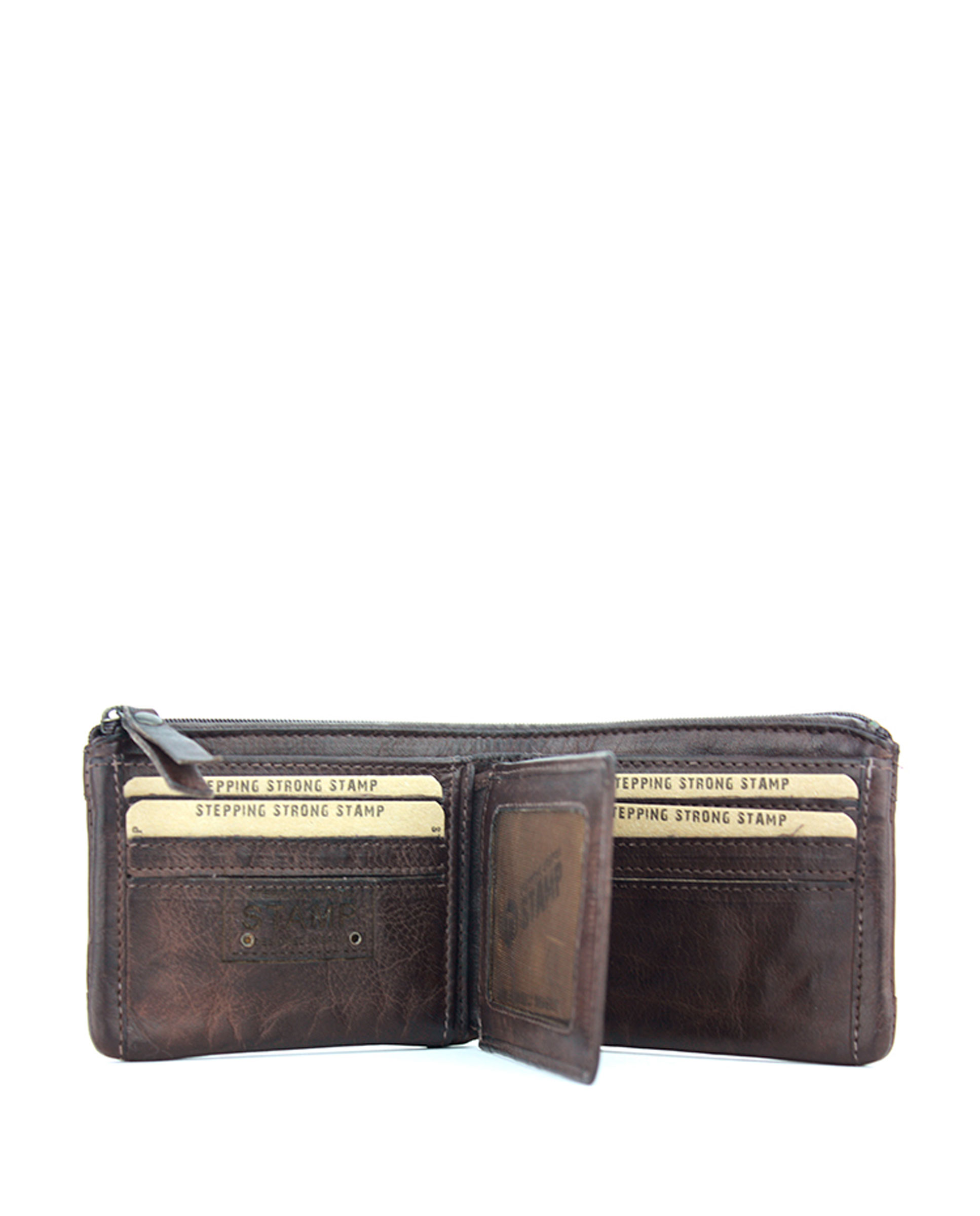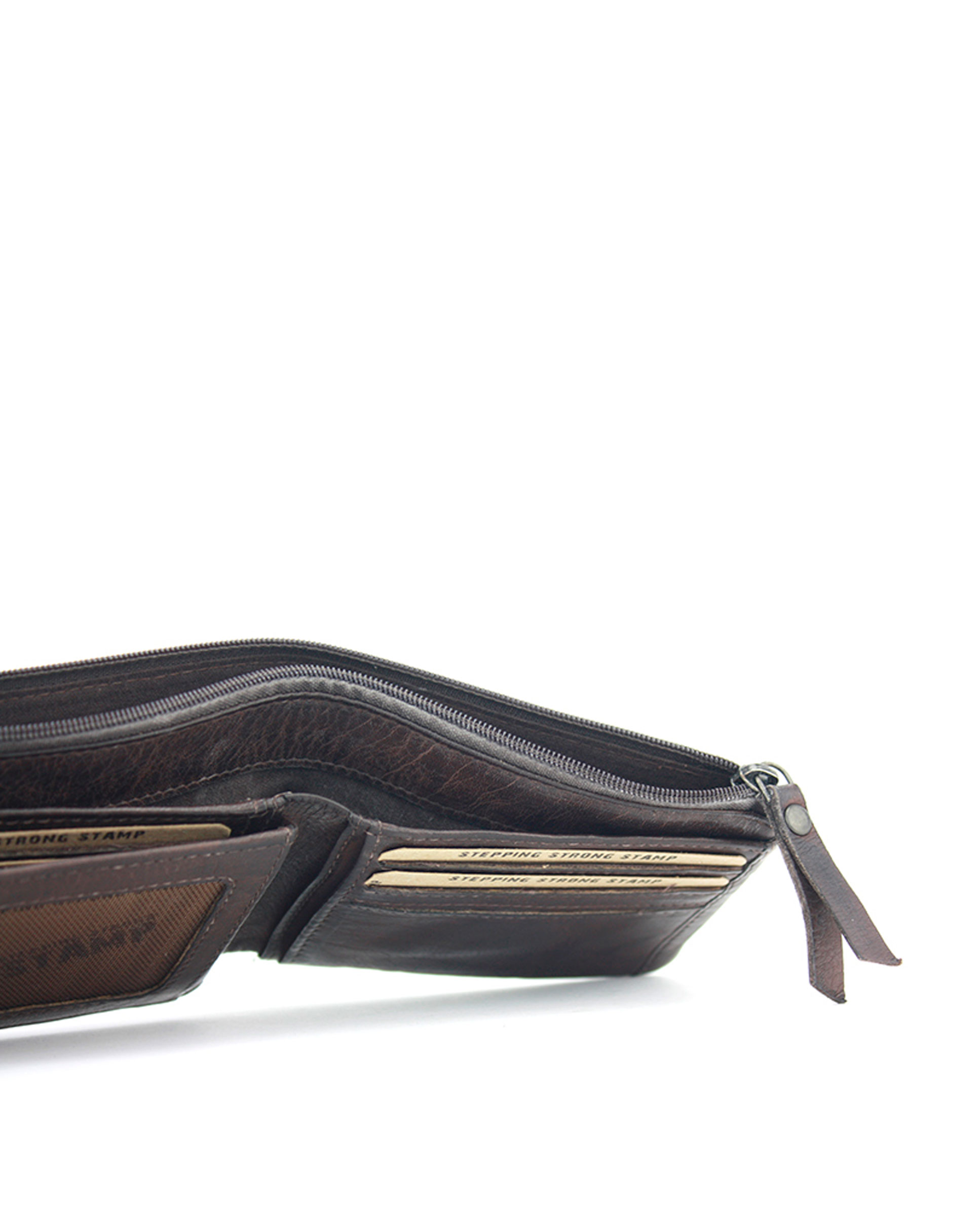 Billetero americano fabricado en piel lavada con capacidad para 10 tarjetas y apartado para billetes. En la parte exterior tiene un bolsillo longitudinal con cremallera que sirve como Portamonedas o como billetero. Colecci贸n Arco.