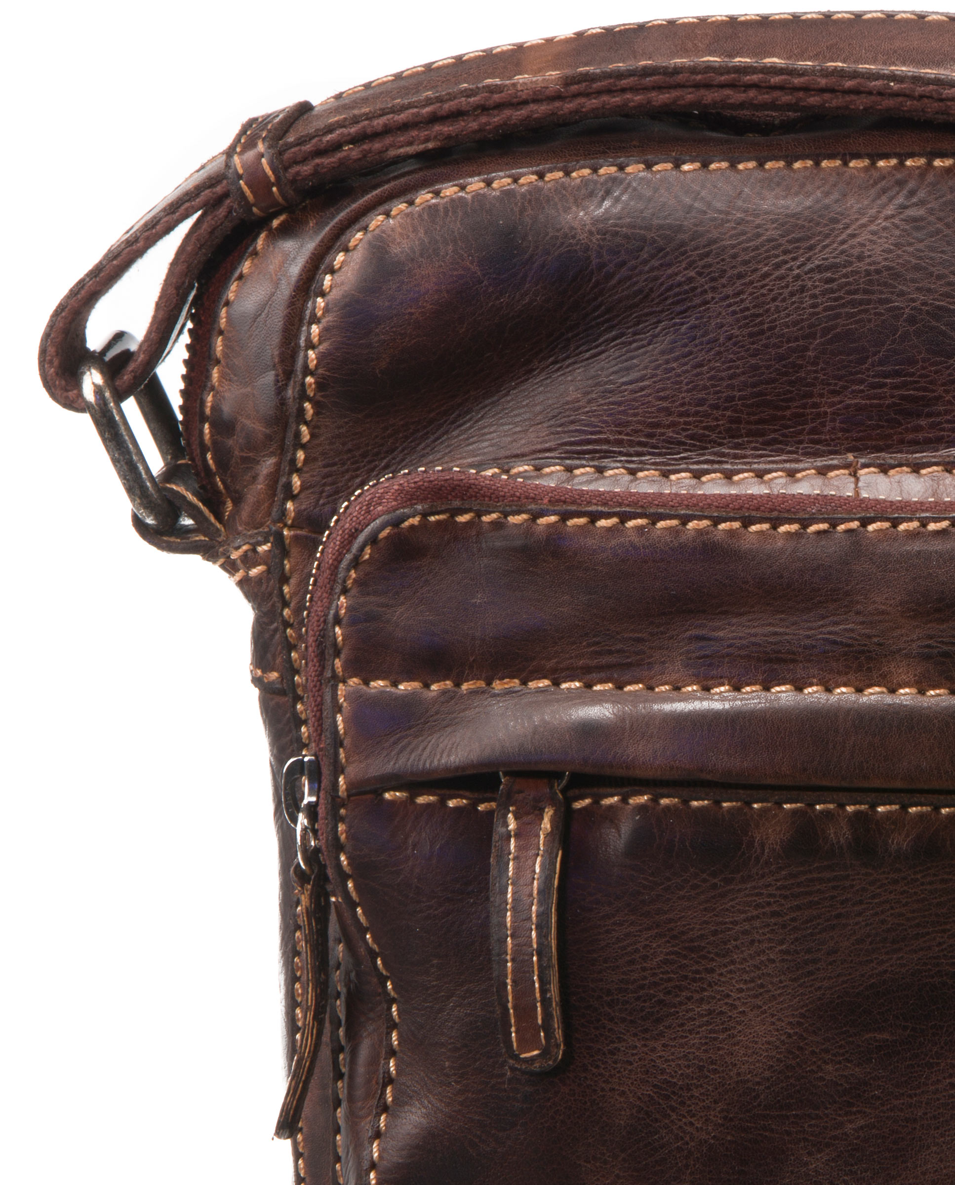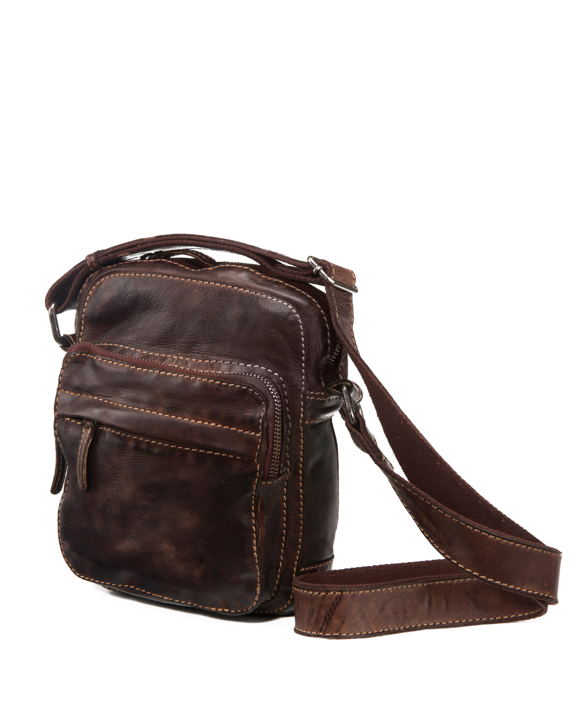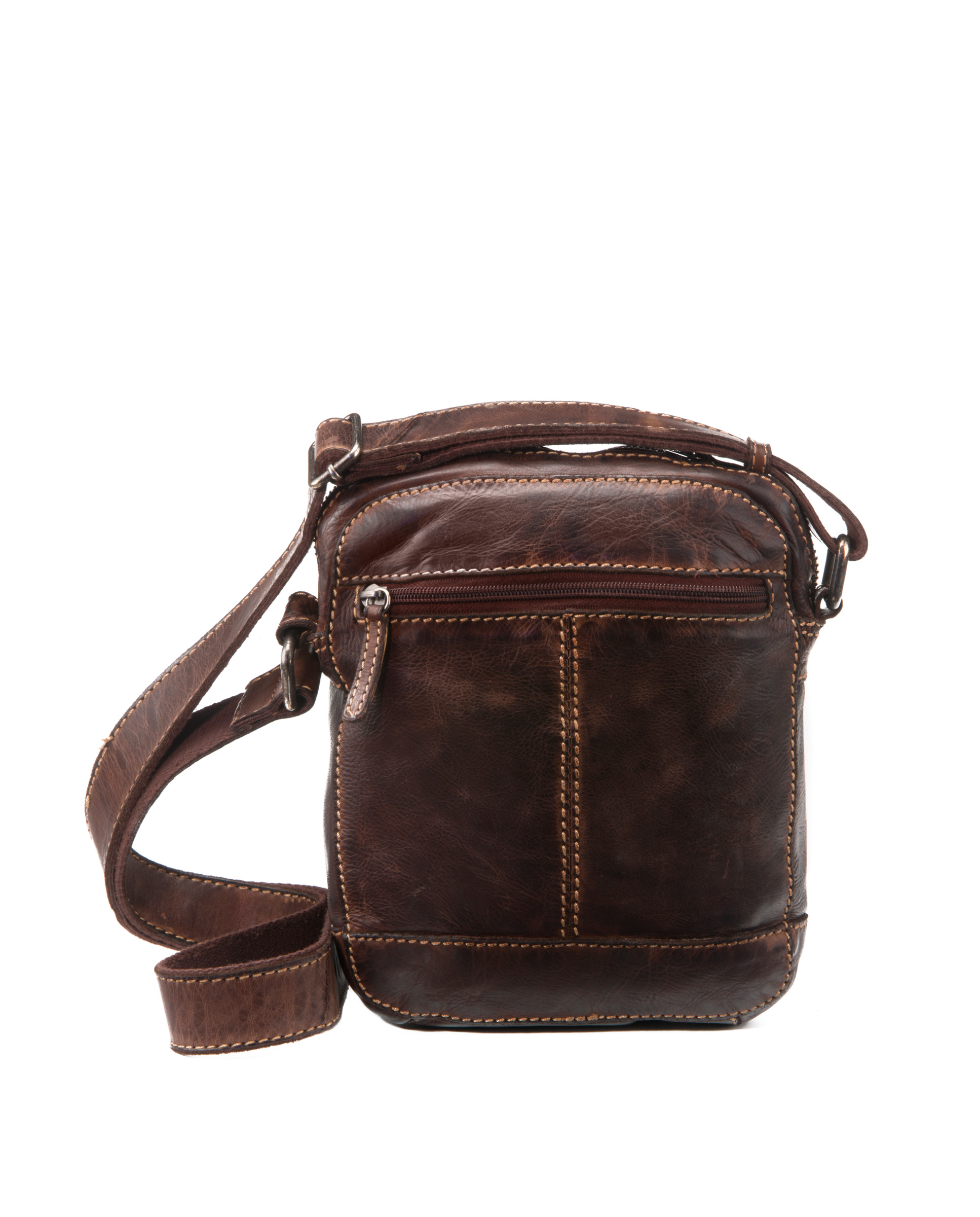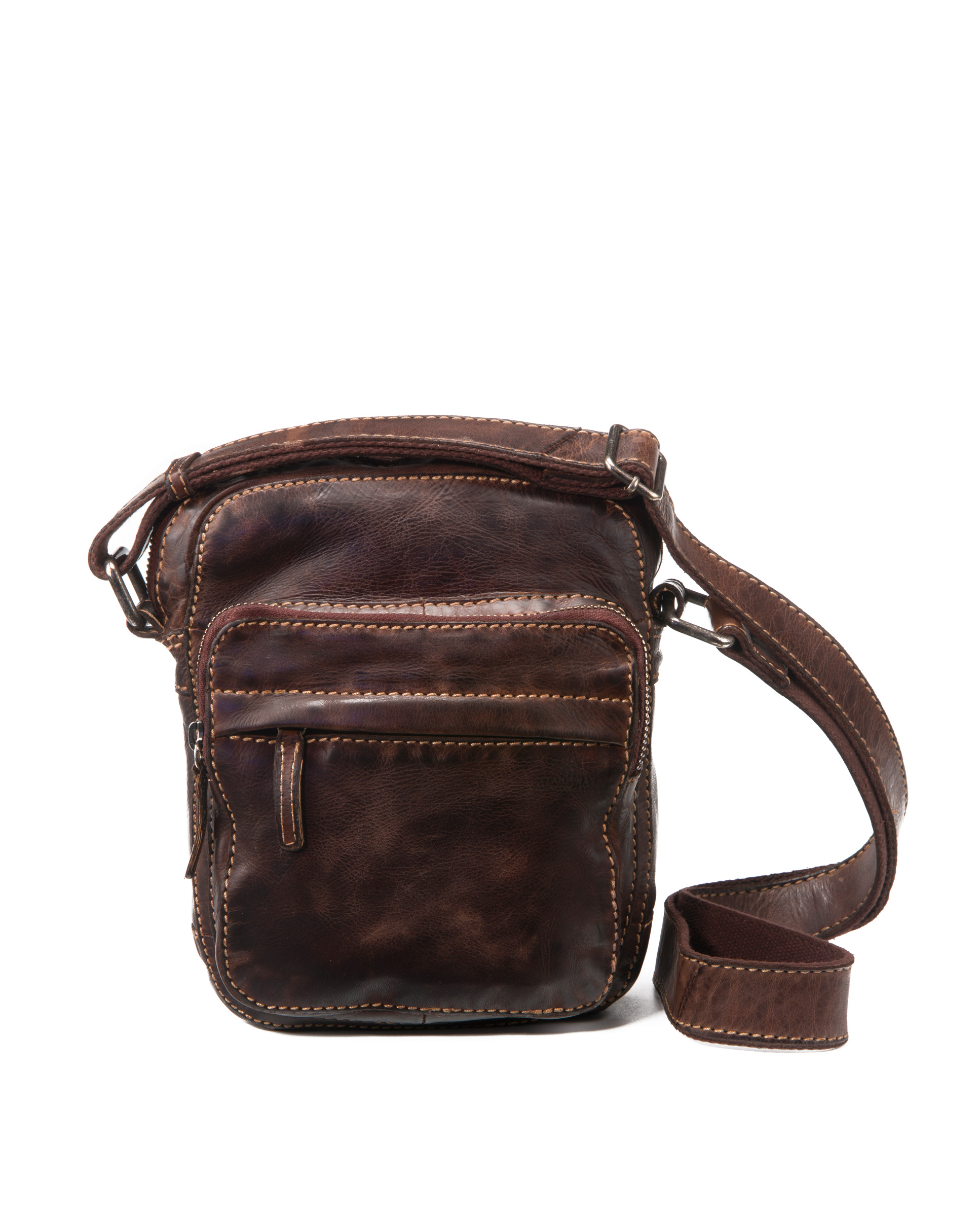 Bolso bandolera en piel lavada de primera calidad con bandolera regulable, para llevar al hombro o cruzado. En la parte delantera dispone de un bolsillo grande con dos cremalleras. Al compartimentos principal se accede gracias a una cremallera en la parte superior. Otra cremallera da acceso a un bolsillo en la parte posterior. Costuras en contraste. Herrajes met谩licos en zamak. Forro de algod贸n. Colecci贸n Tichi.