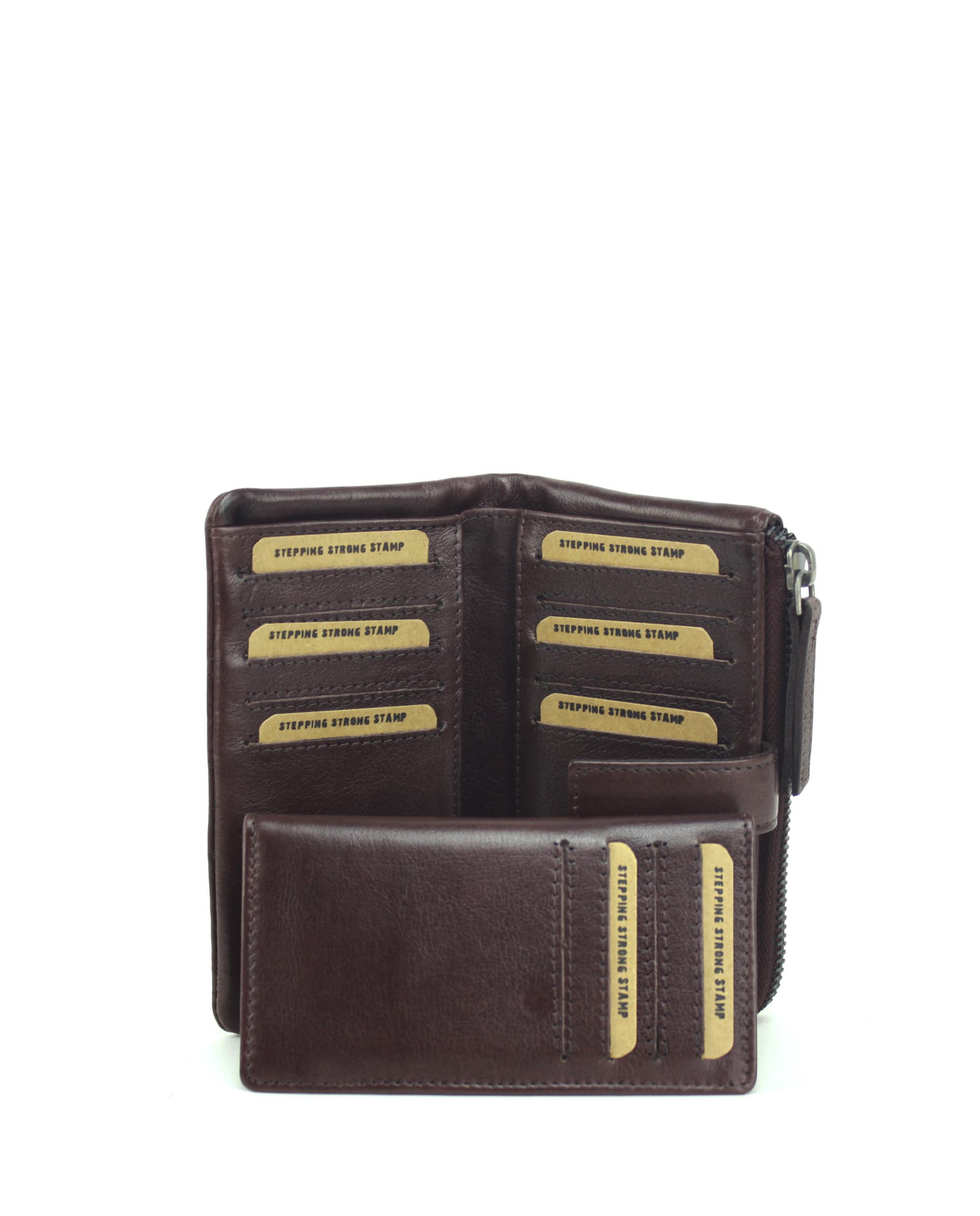 Cartera de mujer fabricada en piel lavada de primera calidad. La colecci贸n Chara de Stamp sigue pisando fuerte y se ve ampliada con nuevos modelos, desde mochilas hasta toda una nueva l铆nea de billeteros, tarjeteros y portamonedas. Como el modelo ST32004, fabricado con los mejores materiales, en color marr贸n y con mucho espacio para ti: