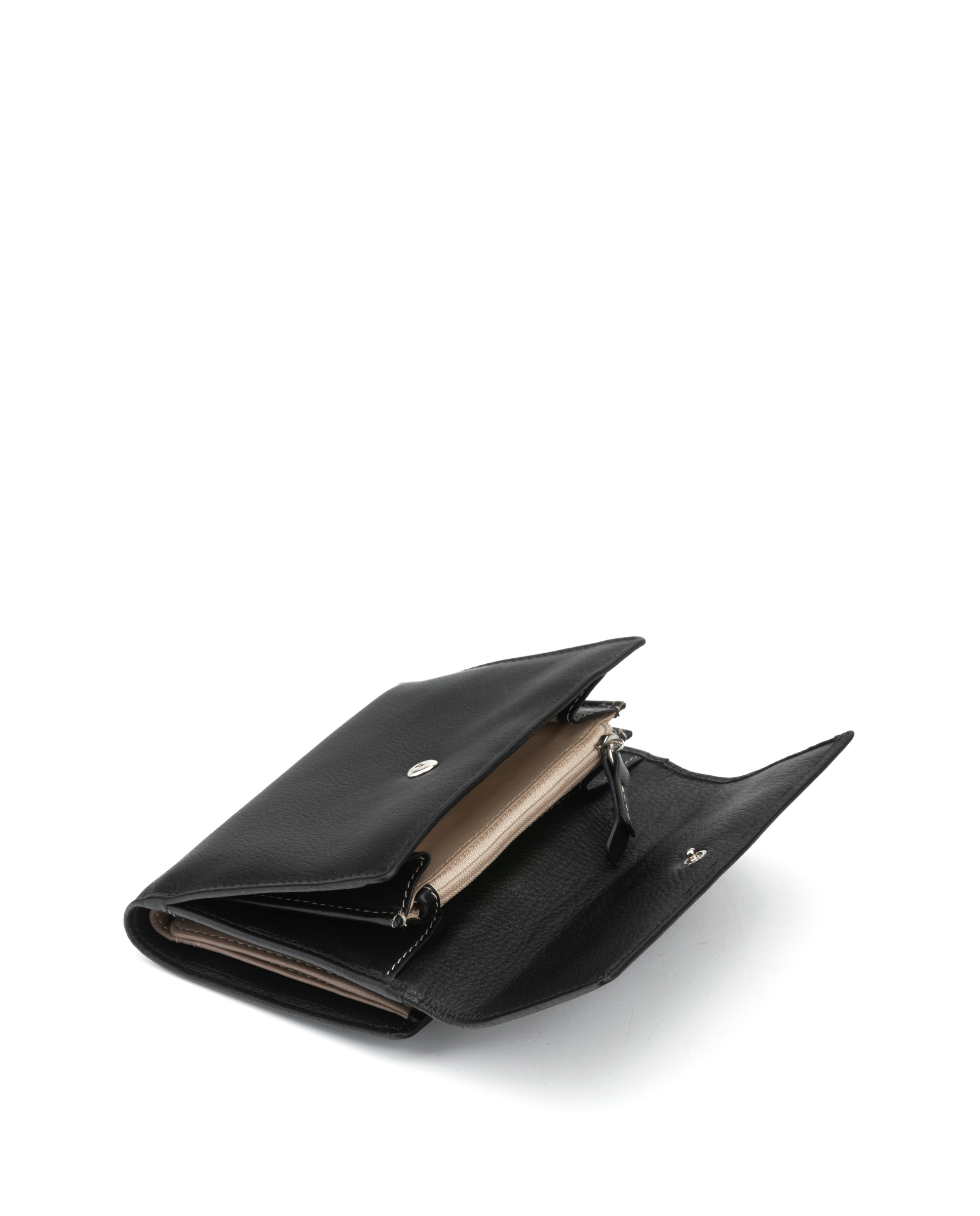 - gran portamonedas exterior de tres apartados, uno de ellos con cremallera, que se cierra con solapa y bot贸n de presi贸n