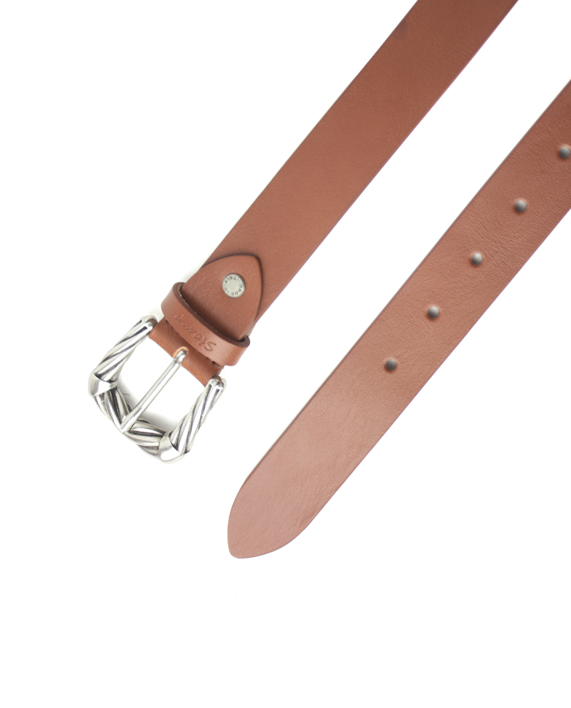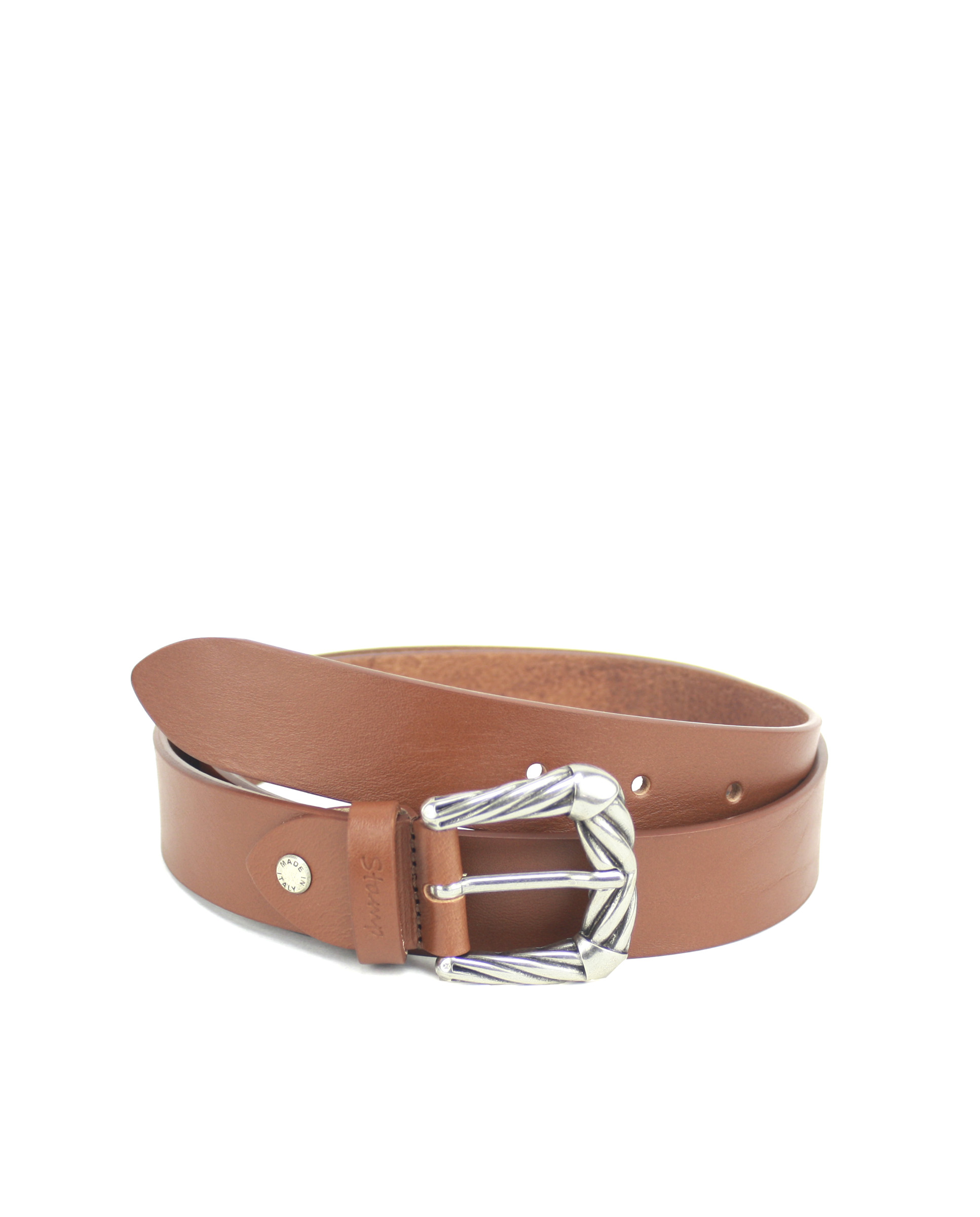 Cintur贸n Stamp de mujer fabricado en piel con original hebilla met谩lica plateada. Se adapta tanto a un vaquero como a un contexto m谩s formal: