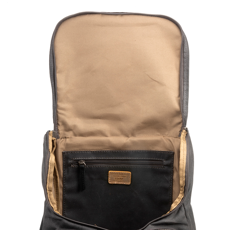 Mochila fabricada en lona encerada, con asas regulables. Dispone de bolsillo exterior con cremallera tanto en la parte frontal como en la parte trasera, adem谩s de otro bolsillo en el interior. Acceder al compartimento principal es muy c贸modo debido a su gran apertura superior. Herrajes met谩licos en zamak. Forro de algod贸n. Colecci贸n Lyon