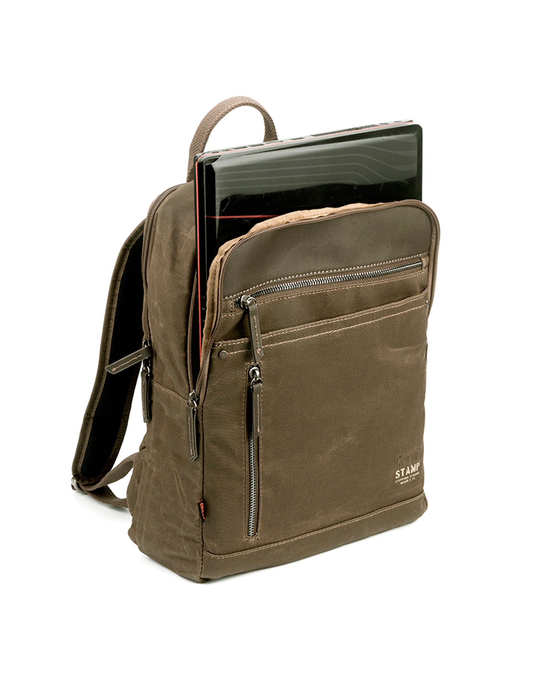 Mochila fabricada en lona encerada, con asas en algod贸n regulables. Tama帽o laptop. Dispone de bolsillo exterior con cremallera tanto en la parte frontal como en la parte trasera, adem谩s de otro bolsillo en el interior. Desde la parte superior, dos cremalleras dan acceso una al compartimento principal, otra al compartimento acolchado para llevar el laptop o ordenador port谩til. Herrajes met谩licos en zamak. Forro de algod贸n. Colecci贸n Lyon