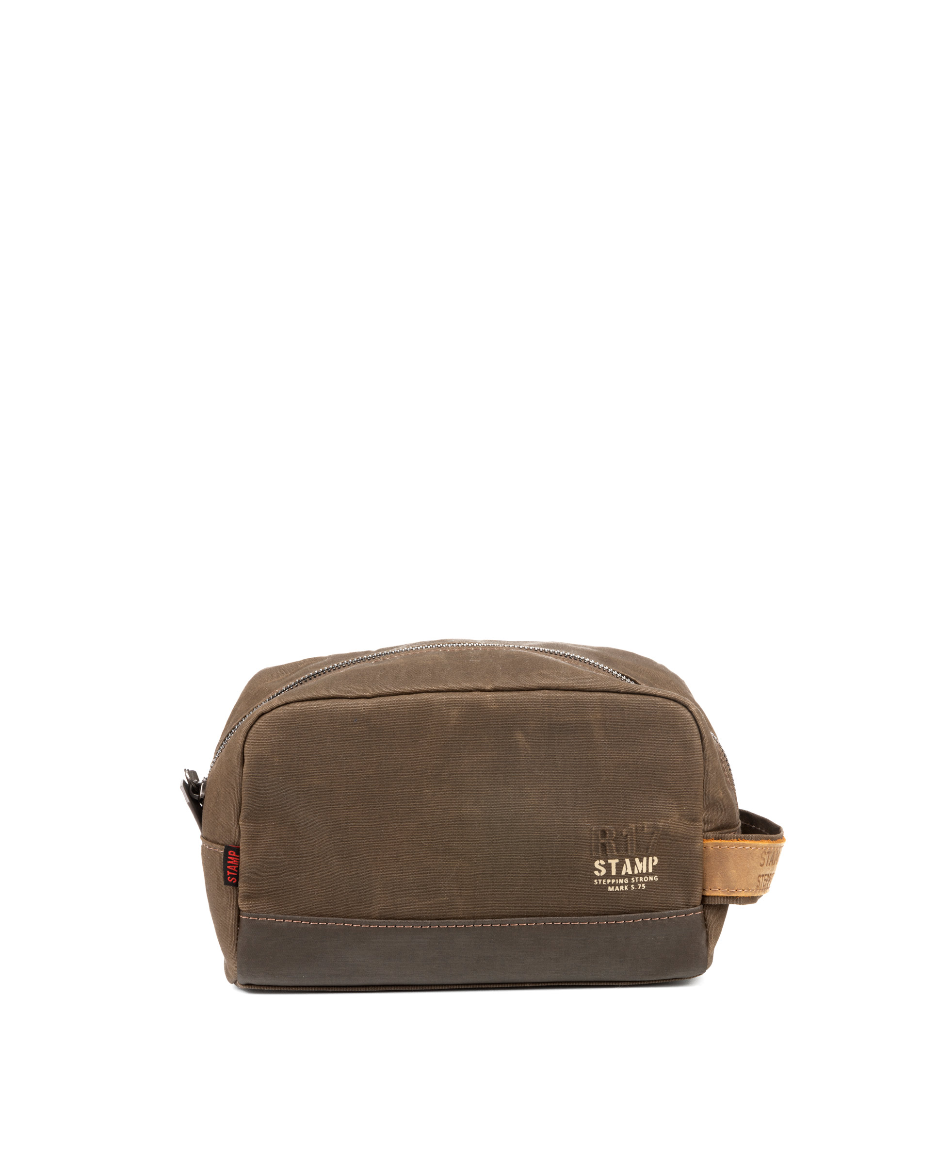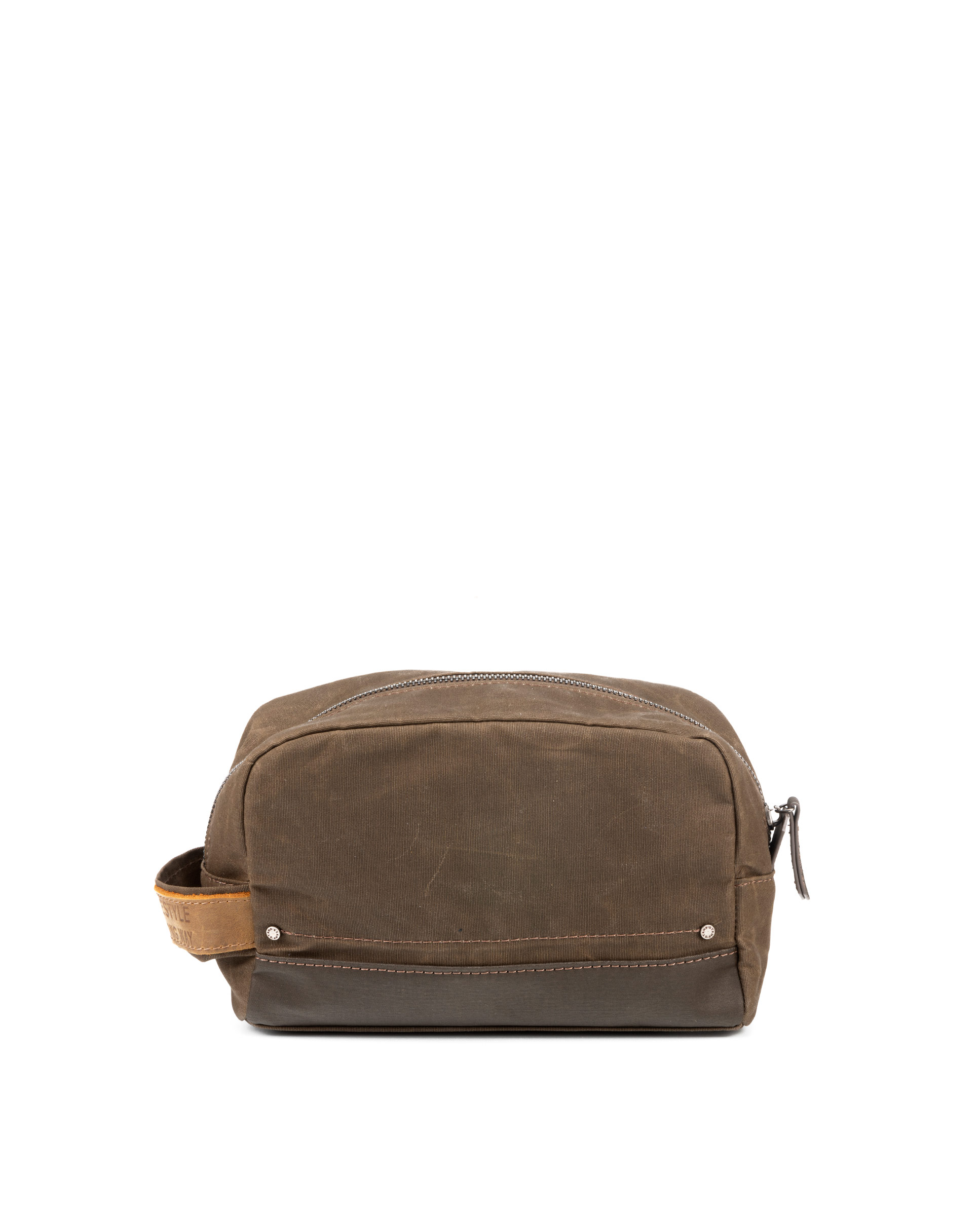 Neceser en lona encerada con cierre de cremallera. Dispone de un bolsillo interior con cremallera y de asa reforzada. Herrajes metálicos en zamak. Forro de algodón. Colección Lyon